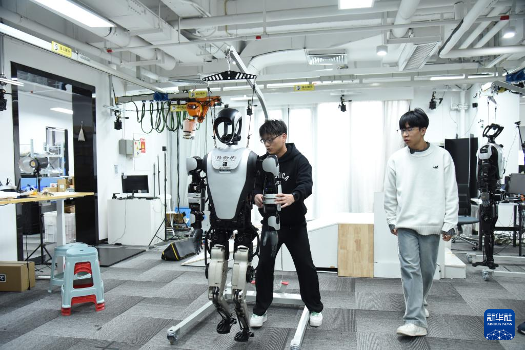 樂聚(深圳)機器人技術有限公司的兩名工作人員正在調(diào)試一臺“夸父”人形機器人(1月21日攝)。新華社記者洪澤華攝