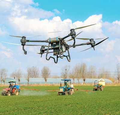 3月16日,山東青島萊西市沽河街道,植保無人機(jī)、長臂噴霧機(jī)在田間對(duì)小麥進(jìn)行管護(hù)。張進(jìn)剛攝(人民視覺)