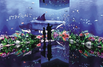 圖為游客在位于濟(jì)南市的山東省美術(shù)館參觀體驗(yàn)“無限之?!背两紸I數(shù)字藝術(shù)展。新華社發(fā)(郝鑫城 攝)