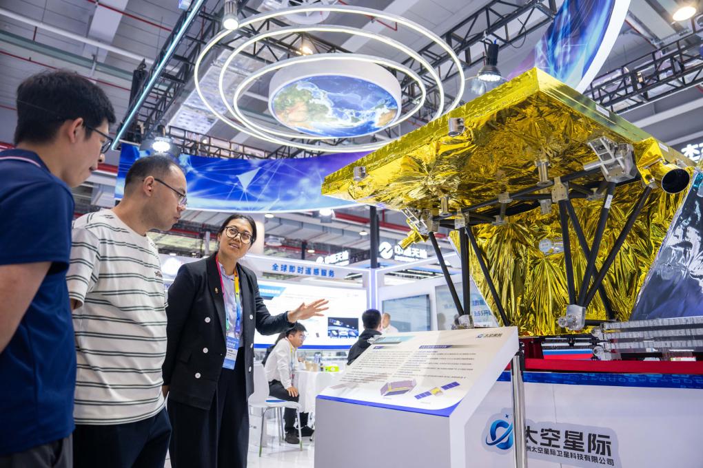 9月24日,第四屆北斗規(guī)模應用國際峰會在湖南株洲開幕。圖為在株洲國際會展中心,工作人員(左三)在介紹一臺對地觀測衛(wèi)星。新華社記者 陳思汗 攝