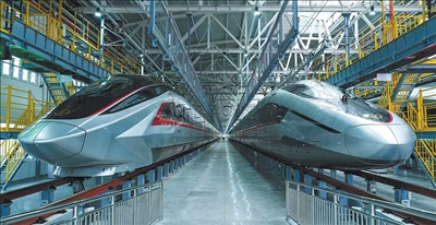 圖為兩列CR450動(dòng)車組樣車??吭诤币瞬齽?dòng)車所。唐 瑩攝(人民視覺)
