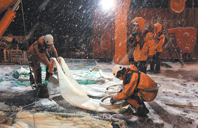 科考隊(duì)領(lǐng)隊(duì)、首席科學(xué)家張?bào)w軍印象最深的一件事,發(fā)生在2023年1月26日凌晨。當(dāng)科考隊(duì)連續(xù)五天五夜進(jìn)行物資卸運(yùn)后,海況突然變差。當(dāng)時(shí)還剩最后3個(gè)批次的卸貨任務(wù),洶涌的海浪不停地拍打著小艇和駁船。駁船隨著涌浪大幅搖擺,此時(shí)駁船上有重達(dá)十幾噸、高達(dá)2米的物資,如果不及時(shí)捆扎,后果不堪設(shè)想。負(fù)責(zé)跟艇作業(yè)的4名科考隊(duì)員毫不猶豫地從小艇沖到了駁船上,迅速進(jìn)行固定操作。凌晨2點(diǎn)半,當(dāng)卸好最后一批物資,大家才如釋重負(fù)。