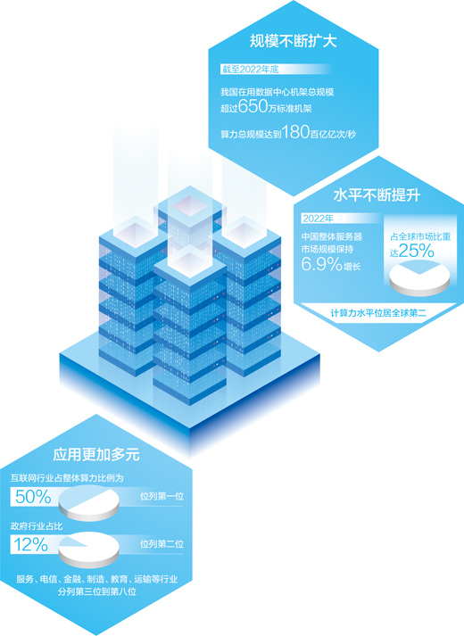 算力作為數(shù)字經濟時代新的生產力,對推動科技進步、賦能行業(yè)數(shù)字化轉型、促進經濟社會發(fā)展發(fā)揮著日益重要的作用。近年來,我國算力產業(yè)不斷發(fā)展、創(chuàng)新能力日益提升,截至2022年底,我國在用數(shù)據中心機架總規(guī)模超過650萬標準機架,算力總規(guī)模達到180百億億次/秒。