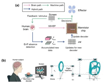 (a)腦-憶阻器交互式更新框架;(b)基于憶阻器腦電解碼的實時腦控無人機飛行。(聯(lián)合研究團隊供圖)