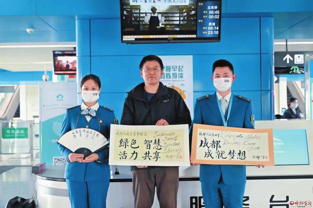 成都大運(yùn)會(huì)期間一爾(中)的書法作品被地鐵志愿者服務(wù)站收藏