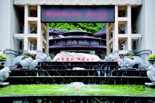校園內(nèi),除隨處可見的石砌欄桿外,每棟建筑均有仿唐式建筑屋頂。西南角一處長約50米、落差15米左右的多級(jí)瀑布群上建有涼亭,四周有假山、水車、棧道、水景、石拱橋等。