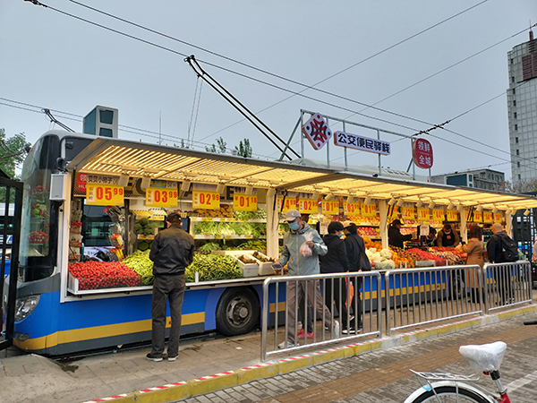 柳芳地鐵站附近開(kāi)設(shè)“公交便民驛?!?,方便居民購(gòu)買(mǎi)果蔬。人民網(wǎng)實(shí)習(xí)生 曹瑞穎攝