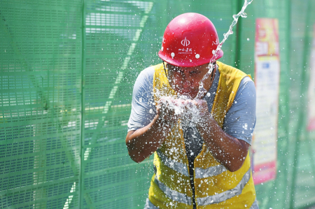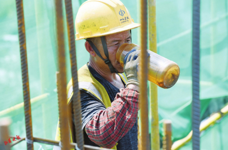 當(dāng)日,是入伏第一天,意味著開始進(jìn)入一年中最熱的時候。在熱火朝天的施工現(xiàn)場,工人師傅們埋頭苦干,他們雖然戴著自制遮陽帽、冰袖,身旁放著水壺,但一小會兒工夫就會汗流浹背?!斑@樣的杯子,我每天要喝好幾杯水?!碧鞖馓珶?,來自四川樂山的林英把杯子里的水一飲而盡。黝黑的皮膚、如雨的汗水、潮濕的后背……當(dāng)大多數(shù)人避暑納涼時,不少勞動者卻辛勤地?fù)]灑著汗水,堅(jiān)守在施工一線。在這個工地上,有很多和林英一樣的打工人,他們來自全國各地,用青春和汗水建設(shè)美麗山西。