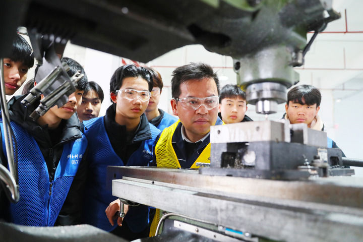 2024年1月9日,在湖南省永州市新田縣產(chǎn)業(yè)開發(fā)區(qū)永州群翰科技有限公司車間,新田縣職業(yè)中等專業(yè)學(xué)校學(xué)生在工廠師傅的指導(dǎo)下學(xué)習(xí)機床操作技術(shù)。近年來,該校聯(lián)合企業(yè)開展“產(chǎn)教融合、校企辦學(xué)”模式,助推就業(yè)創(chuàng)業(yè)。新華社發(fā)(劉貴雄 攝)