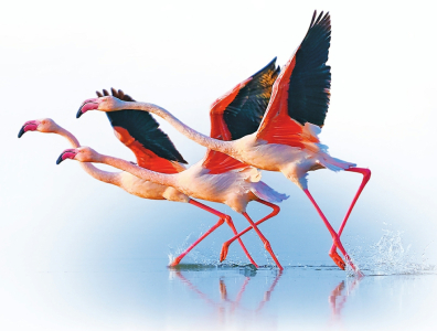 11月23日,初冬的運城濕地省級自然保護(hù)區(qū)(鹽湖段)水面澄澈,灘涂鋪展,火烈鳥亭亭玉立,時而低頭啄食,時而曲頸戲水,時而平展振翅。