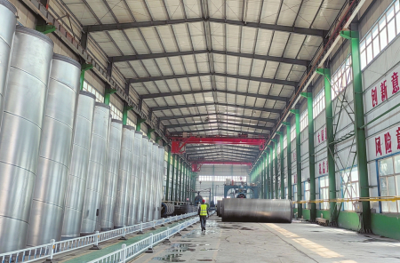 韓建河山朔州分公司生產(chǎn)車(chē)間,等待試壓檢驗(yàn)的鋼筒。