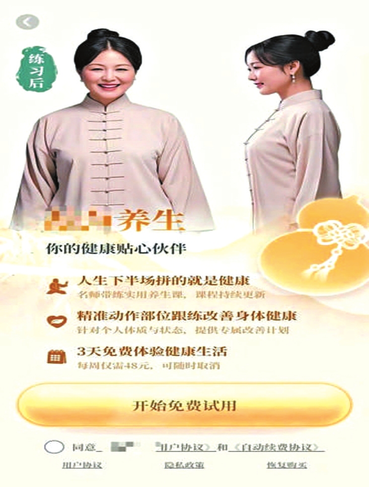 還有些App則更加離譜,下載完成后,點進去的第一步就是要購買會員,之后才能正常使用。但在購買流程上,平臺卻耍起了花招。比如一款提供“養(yǎng)生指導服務”的App,頁面上會有一個大大的按鈕,寫著“開始免費試用”。但在按鈕的旁邊,卻有一行非常不起眼的小字:“每周僅需48元,可隨時取消?!倍坏┯脩酎c擊開始試用,系統(tǒng)就會跳轉到自動續(xù)費的開通界面。如果是辨別能力差的老人,可能還以為是在填寫什么注冊信息。