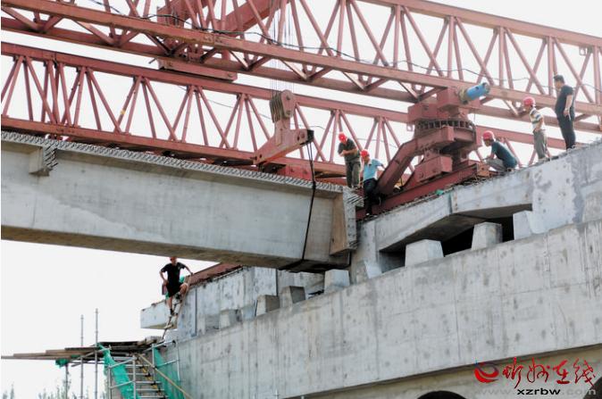 7月29日,原平市前進街東拓工程滹沱河大橋施工工地,大橋主跨預制混凝土橫梁從牽引車上徐徐吊起,穩(wěn)穩(wěn)地安放在主橋墩上。該預制混凝土橫梁長30米、高1.6米、寬2.4米,總重量93噸。這一突破性推進將大大加快工程進度。 褚 震 攝