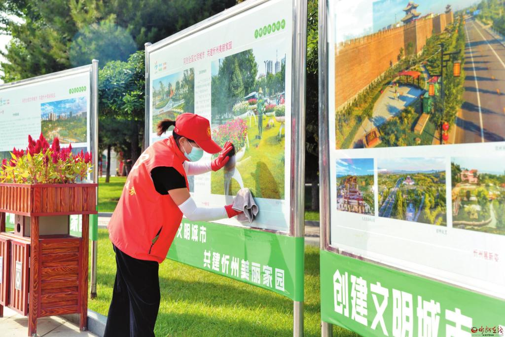 9月9日,市園林服務中心的志愿者正在忻州城區(qū)體育廣場清潔宣傳欄。眼下正處于創(chuàng)建全國文明城市的攻堅階段,忻州市各單位的志愿者紛紛走上街頭、廣場、小區(qū),為創(chuàng)文助力。 張存良 攝