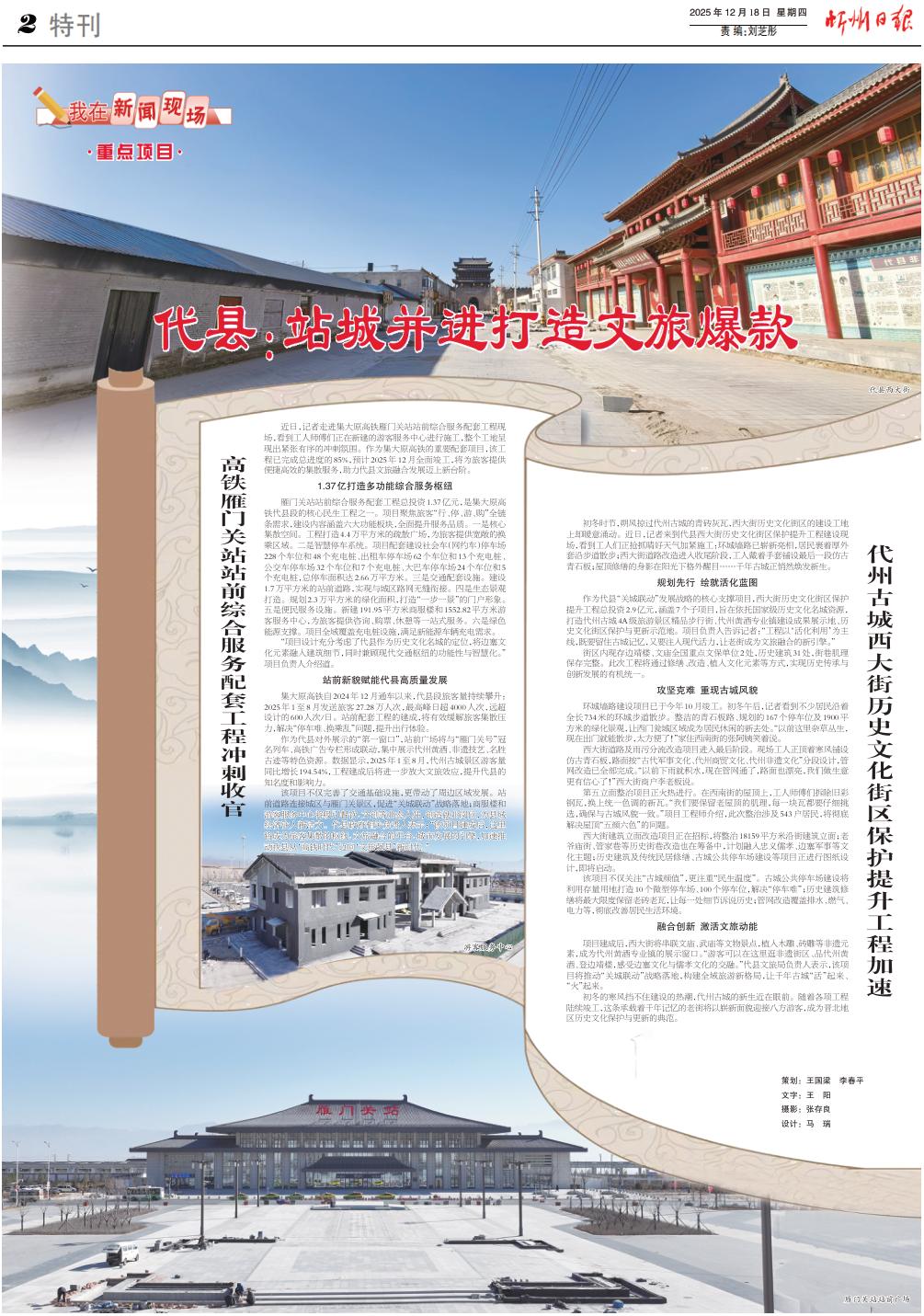 作為代縣對(duì)外展示的“第一窗口”,站前廣場(chǎng)將與“雁門關(guān)號(hào)”冠名列車、高鐵廣告專欄形成聯(lián)動(dòng),集中展示代州黃酒、非遺技藝、名勝古跡等特色資源。數(shù)據(jù)顯示,2025年1至8月,代州古城景區(qū)游客量同比增長194.54%,工程建成后將進(jìn)一步放大文旅效應(yīng),提升代縣的知名度和影響力。