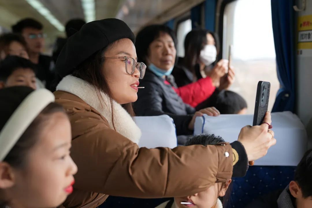 列車駛出運城站,工作人員開始為旅客熱心介紹打卡拍照的最佳地點和周邊的名勝古跡,并且精心準備了小道具,方便大家打卡拍照。