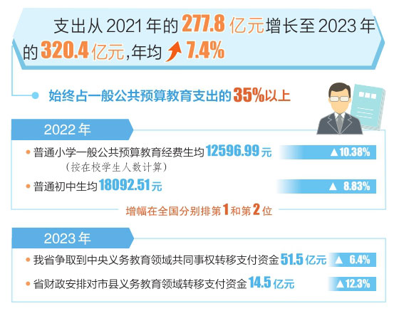近年來,我省財(cái)政部門把義務(wù)教育作為重中之重優(yōu)先保障。2023年,我省爭取到中央義務(wù)教育領(lǐng)域共同事權(quán)轉(zhuǎn)移支付資金51.5億元,增長6.4%;同時(shí),省財(cái)政安排對(duì)市縣義務(wù)教育領(lǐng)域轉(zhuǎn)移支付資金14.5億元,增長12.3%。據(jù)全國教育經(jīng)費(fèi)執(zhí)行情況統(tǒng)計(jì)最新公告數(shù)據(jù),2022年,我省普通小學(xué)一般公共預(yù)算教育經(jīng)費(fèi)生均12596.99元(按在校學(xué)生人數(shù)計(jì)算),增長10.38%,普通初中生均18092.51元,增長8.83%,增幅在全國分別排第1和第2位。