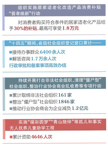 “十四五”期間,我省堅持“規(guī)范與發(fā)展并重、監(jiān)管與服務并舉”,持續(xù)深化改革,健全體制機制,完善政策措施,推動社會組織高質量發(fā)展取得新成效。推行“零見面審批、最多跑一次”和線上年報“零跑動”,省、市、縣三級社會組織登記實現“一網通辦”。統(tǒng)一規(guī)范申請材料、表格表單、辦事流程、章程文本等,政務服務標準化、規(guī)范化水平持續(xù)提升。推進社會組織規(guī)范化建設,健全綜合監(jiān)管、聯(lián)合執(zhí)法、資金管理等制度機制,加強對社會組織名稱、宗旨、業(yè)務范圍、發(fā)起人和擬任負責人的審核把關,強化對社會組織內部治理、人員、資金、活動等日常監(jiān)管。持續(xù)開展打擊非法社會組織、清理“僵尸型”社會組織、整治行業(yè)協(xié)會商會亂收費等專項行動,推動行業(yè)協(xié)會商會為企業(yè)減負1.2億元。