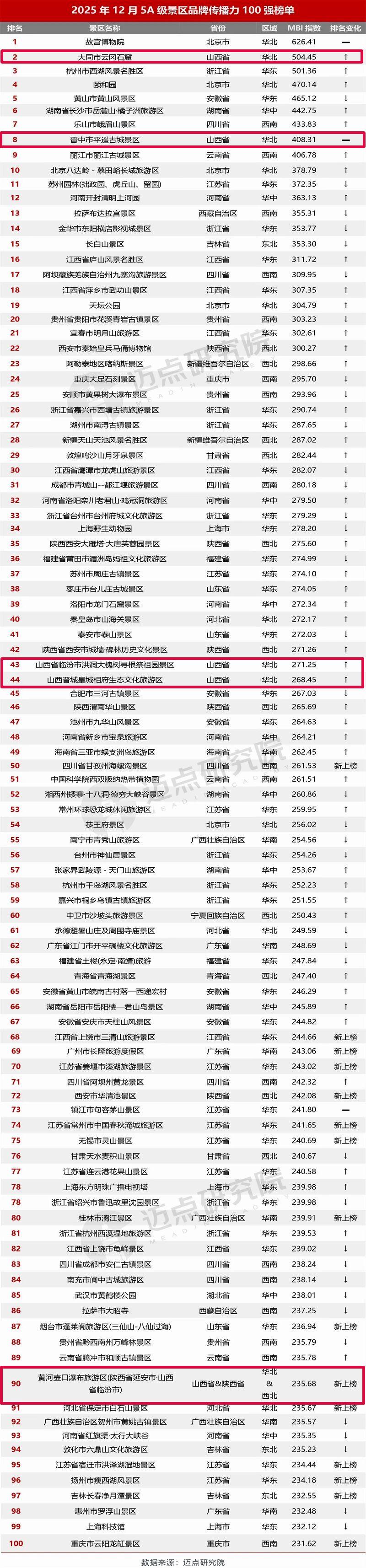 邁點(diǎn)研究院1月16日發(fā)布“2025年12月5A級(jí)景區(qū)品牌傳播力100強(qiáng)榜單”,山西省5家景區(qū)榜上有名,分別是云岡石窟、平遙古城、洪洞大槐樹(shù)、皇城相府、壺口瀑布景區(qū),其中壺口瀑布景區(qū)為新上榜。