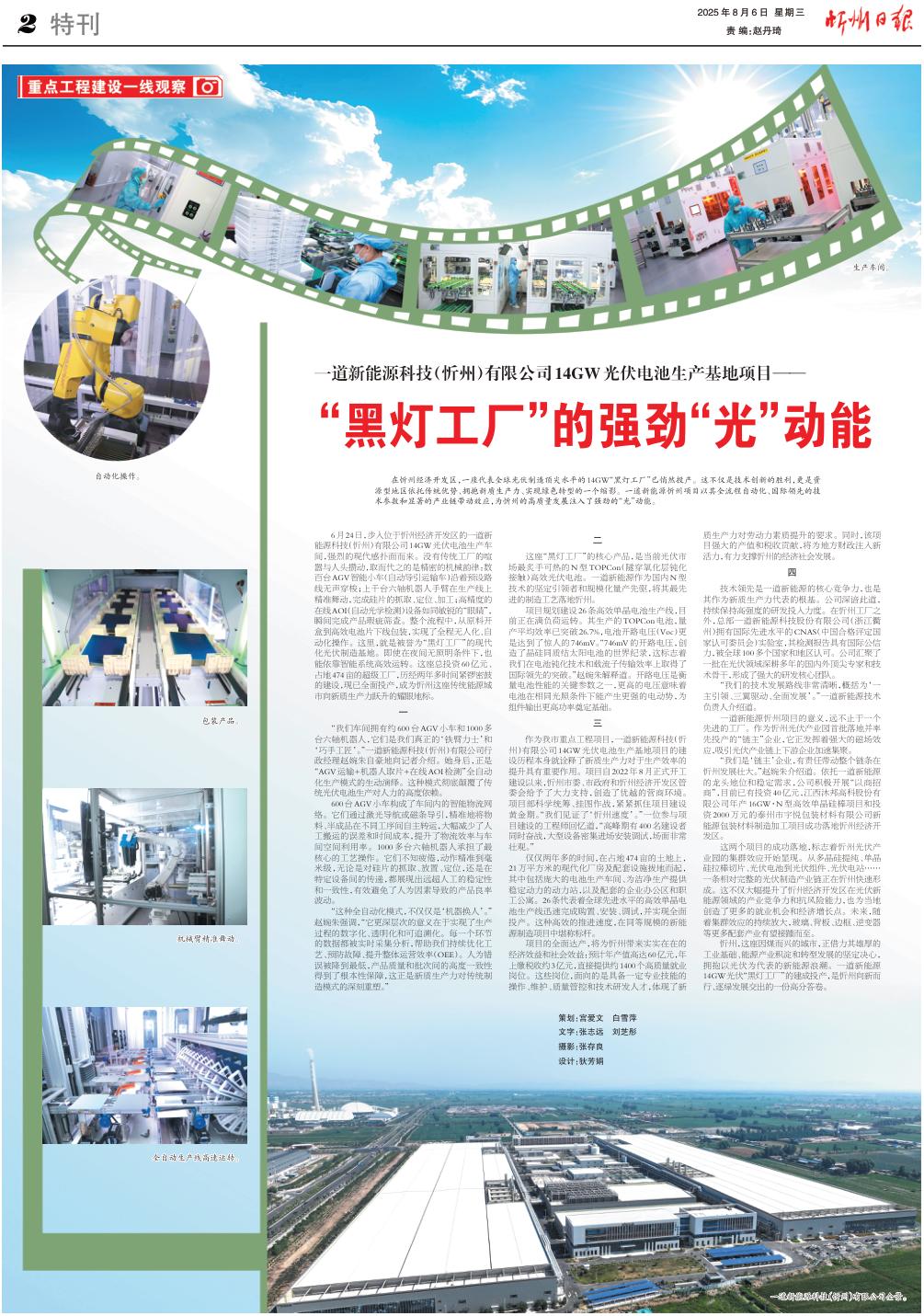 6月24日,步入位于忻州經(jīng)濟開發(fā)區(qū)的一道新能源科技(忻州)有限公司14GW光伏電池生產(chǎn)車間,強烈的現(xiàn)代感撲面而來。沒有傳統(tǒng)工廠的喧囂與人頭攢動,取而代之的是精密的機械韻律:數(shù)百臺AGV智能小車(自動導(dǎo)引運輸車)沿著預(yù)設(shè)路線無聲穿梭;上千臺六軸機器人手臂在生產(chǎn)線上精準(zhǔn)舞動,完成硅片的抓取、定位、加工;高精度的在線AOI(自動光學(xué)檢測)設(shè)備如同敏銳的“眼睛”,瞬間完成產(chǎn)品瑕疵篩查。整個流程中,從原料開盒到高效電池片下線包裝,實現(xiàn)了全程無人化、自動化操作。這里,就是被譽為“黑燈工廠”的現(xiàn)代化光伏制造基地。即使在夜間無照明條件下,也能依靠智能系統(tǒng)高效運轉(zhuǎn)。這座總投資60億元、占地474畝的超級工廠,歷經(jīng)兩年多時間緊鑼密鼓的建設(shè),現(xiàn)已全面投產(chǎn),成為忻州這座傳統(tǒng)能源城市向新質(zhì)生產(chǎn)力躍升的耀眼地標(biāo)。