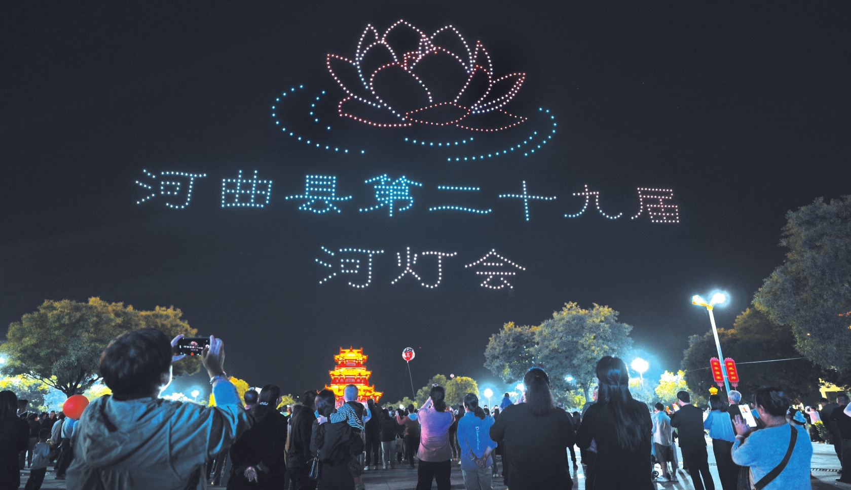 為期三天的無人機表演,創(chuàng)新采用3D動態(tài)編隊技術,通過40組高精度畫面切換,將河曲的地理標志、文化符號與時代精神深度融合,實現(xiàn)“一幕一主題、幀幀皆故事”的沉浸式體驗,以“科技+文旅”讓市民和游客領略大美河曲的獨特魅力。市民張一婷說:“能在家門口看到這么高水平的無人機表演,挺自豪的。這種創(chuàng)新的‘文化表達’方式將我們家鄉(xiāng)的故事用高科技手段‘寫’在了夜空這張畫卷上。這說明家鄉(xiāng)的發(fā)展不只在經濟方面,更是一種文化上的自信與創(chuàng)新。河燈與無人機燈光天地呼應,是傳統(tǒng)與現(xiàn)代的完美融合。”