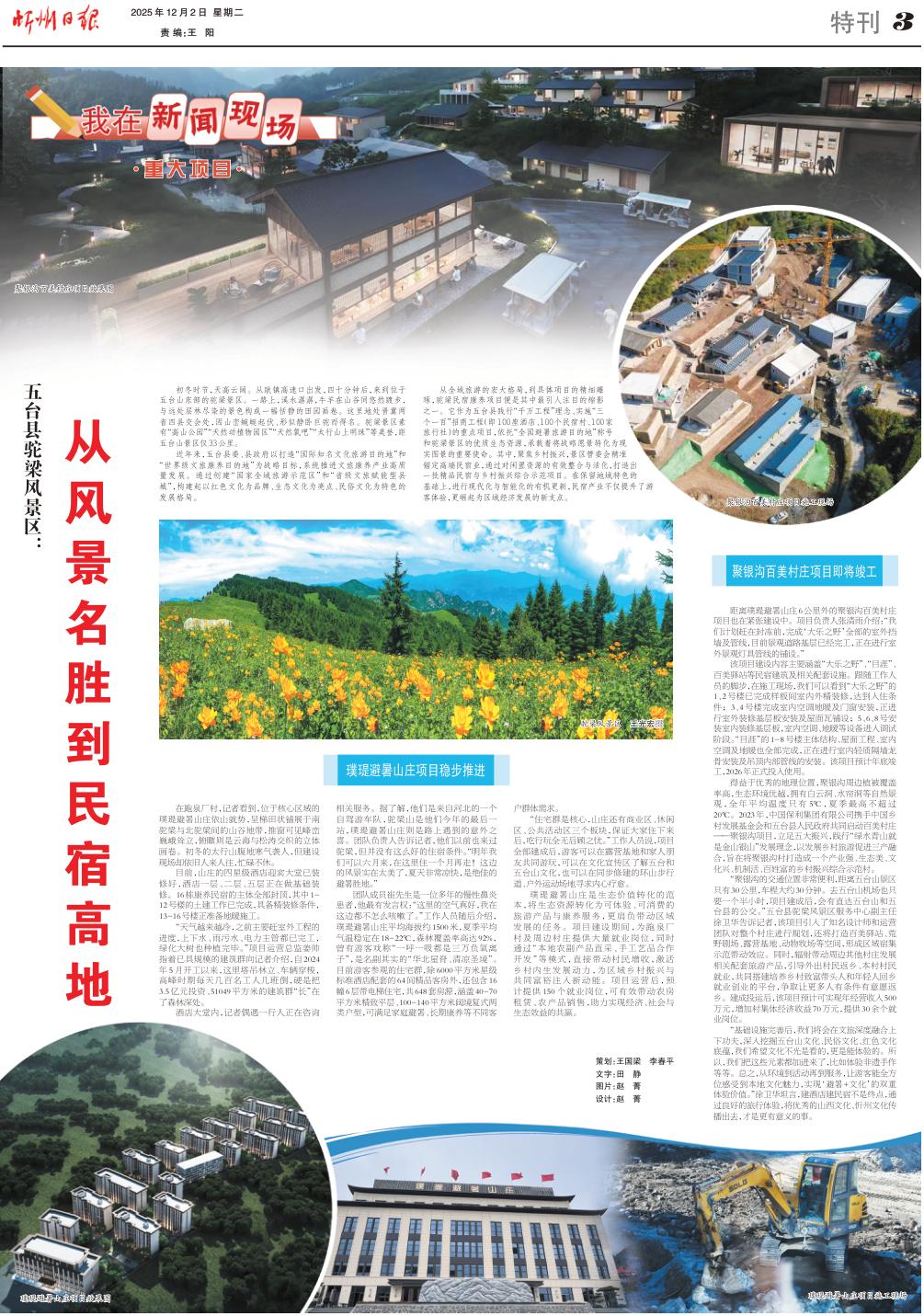 初冬時(shí)節(jié),天高云闊。從耿鎮(zhèn)高速口出發(fā),四十分鐘后,來(lái)到位于五臺(tái)山東部的駝梁景區(qū)。一路上,溪水潺潺,牛羊在山谷間悠然踱步,與遠(yuǎn)處層林盡染的景色構(gòu)成一幅恬靜的田園畫卷。這里地處晉冀兩省四縣交會(huì)處,因山巒蜿蜒起伏、形似靜臥巨駝而得名。駝梁景區(qū)素有“高山公園“”天然動(dòng)植物園區(qū)”“天然氧吧“”太行山上明珠”等美譽(yù),距五臺(tái)山景區(qū)僅33公里。 近年來(lái),五臺(tái)縣委、縣政府以打造“國(guó)際知名文化旅游目的地”和“世界級(jí)文旅康養(yǎng)目的地”為戰(zhàn)略目標(biāo),系統(tǒng)推進(jìn)文旅康養(yǎng)產(chǎn)業(yè)高質(zhì)量發(fā)展。通過(guò)創(chuàng)建“國(guó)家全域旅游示范區(qū)”和“省級(jí)文旅賦能型縣城”,構(gòu)建起以紅色文化為品牌、生態(tài)文化為亮點(diǎn)、民俗文化為特色的發(fā)展格局。 從全域旅游的宏大格局,到具體項(xiàng)目的精細(xì)雕琢,駝梁民宿康養(yǎng)項(xiàng)目便是其中最引人注目的縮影之一。它作為五臺(tái)縣踐行“千萬(wàn)工程”理念、實(shí)施“三個(gè)一百”招商工程(即100座酒店、100個(gè)民宿村、100家旅行社)的重點(diǎn)項(xiàng)目,依托“全國(guó)避暑旅游目的地”稱號(hào)和駝梁景區(qū)的優(yōu)質(zhì)生態(tài)資源,承載著將戰(zhàn)略愿景轉(zhuǎn)化為現(xiàn)實(shí)圖景的重要使命。其中,聚焦鄉(xiāng)村振興,景區(qū)管委會(huì)精準(zhǔn)錨定高端民宿業(yè),通過(guò)對(duì)閑置資源的有效整合與活化,打造出一批精品民宿與鄉(xiāng)村振興綜合示范項(xiàng)目。在保留地域特色的基礎(chǔ)上,進(jìn)行現(xiàn)代化與智能化的有機(jī)更新,民宿產(chǎn)業(yè)不僅提升了游客體驗(yàn),更崛起為區(qū)域經(jīng)濟(jì)發(fā)展的新支點(diǎn)。 璞瑅避暑山莊項(xiàng)目穩(wěn)步推進(jìn) 在跑泉廠村,記者看到,位于核心區(qū)域的璞瑅避暑山莊依山就勢(shì),呈梯田狀鋪展于南駝梁與北駝梁間的山谷地帶,推窗可見(jiàn)峰巒巍峨聳立,俯瞰則是云海與松濤交織的立體畫卷。初冬的太行山腹地寒氣襲人,但建設(shè)現(xiàn)場(chǎng)卻依舊人來(lái)人往,忙碌不休。 目前,山莊的四星級(jí)酒店迎賓大堂已裝修好,酒店一層、二層、五層正在做基礎(chǔ)裝修。16棟康養(yǎng)民宿的主體全部封頂,其中1-12號(hào)樓的土建工作已完成,具備精裝修條件,13-16號(hào)樓正準(zhǔn)備地暖施工。 “天氣越來(lái)越冷,之前主要趕室外工程的進(jìn)度,上下水、雨污水、電力主管都已完工,綠化大樹(shù)也種植完畢?!表?xiàng)目運(yùn)營(yíng)總監(jiān)姜帥指著已具規(guī)模的建筑群向記者介紹,自2024年5月開(kāi)工以來(lái),這里塔吊林立、車輛穿梭,高峰時(shí)期每天幾百名工人幾班倒,硬是把3.5億元投資、51049平方米的建筑群“長(zhǎng)”在了森林深處。 酒店大堂內(nèi),記者偶遇一行人正在咨詢相關(guān)服務(wù)。據(jù)了解,他們是來(lái)自河北的一個(gè)自駕游車隊(duì),駝梁山是他們今年的最后一站,璞瑅避暑山莊則是路上遇到的意外之喜。團(tuán)隊(duì)負(fù)責(zé)人告訴記者,他們以前也來(lái)過(guò)駝梁,但并沒(méi)有這么好的住宿條件?!懊髂晡覀兛梢粤聛?lái),在這里住一個(gè)月再走!這邊的風(fēng)景實(shí)在太美了,夏天非常涼快,是絕佳的避暑勝地?!?/p> 團(tuán)隊(duì)成員崔先生是一位多年的慢性鼻炎患者,他最有發(fā)言權(quán):“這里的空氣真好,我在這邊都不怎么咳嗽了。”工作人員隨后介紹,璞瑅避暑山莊平均海拔約1500米,夏季平均氣溫穩(wěn)定在18-22℃,森林覆蓋率高達(dá)92%,曾有游客戲稱“一呼一吸都是三萬(wàn)負(fù)氧離子”,是名副其實(shí)的“華北屋脊、清涼圣境”。目前游客參觀的住宅群,除6000平方米星級(jí)標(biāo)準(zhǔn)酒店配套的64間精品客房外,還包含16幢6層帶電梯住宅,共648套房源,涵蓋40-70平方米精致平層、100-140平方米闊境復(fù)式兩類戶型,可滿足家庭避暑、長(zhǎng)期康養(yǎng)等不同客戶群體需求。 “住宅群是核心,山莊還有商業(yè)區(qū)、休閑區(qū)、公共活動(dòng)區(qū)三個(gè)板塊,保證大家住下來(lái)后,吃行玩全無(wú)后顧之憂?!惫ぷ魅藛T說(shuō),項(xiàng)目全部建成后,游客可以在露營(yíng)基地和家人朋友共同游玩,可以在文化宣傳區(qū)了解五臺(tái)和五臺(tái)山文化,也可以在同步修建的環(huán)山步行道、戶外運(yùn)動(dòng)場(chǎng)地尋求內(nèi)心療愈。 璞瑅避暑山莊是生態(tài)價(jià)值轉(zhuǎn)化的范本,將生態(tài)資源轉(zhuǎn)化為可體驗(yàn)、可消費(fèi)的旅游產(chǎn)品與康養(yǎng)服務(wù),更肩負(fù)帶動(dòng)區(qū)域發(fā)展的任務(wù)。項(xiàng)目建設(shè)期間,為跑泉廠村及周邊村莊提供大量就業(yè)崗位,同時(shí)通過(guò)“本地農(nóng)副產(chǎn)品直采、手工藝品合作開(kāi)發(fā)”等模式,直接帶動(dòng)村民增收,激活鄉(xiāng)村內(nèi)生發(fā)展動(dòng)力,為區(qū)域鄉(xiāng)村振興與共同富裕注入新動(dòng)能。項(xiàng)目運(yùn)營(yíng)后,預(yù)計(jì)提供150個(gè)就業(yè)崗位,可有效帶動(dòng)農(nóng)房租賃、農(nóng)產(chǎn)品銷售,助力實(shí)現(xiàn)經(jīng)濟(jì)、社會(huì)與生態(tài)效益的共贏。 聚銀溝百美村莊項(xià