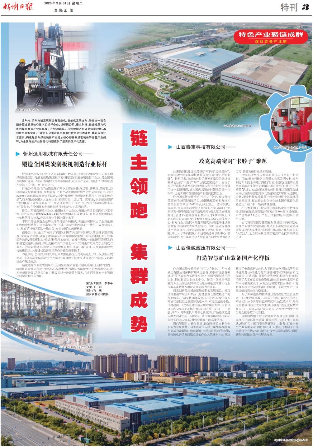 近年來(lái),忻州市錨定煤炭裝備高端化、智能化發(fā)展方向,培育出一批在細(xì)分領(lǐng)域掌握核心技術(shù)的標(biāo)桿企業(yè),以忻通公司、泰寶科技、佳誠(chéng)液壓為代表的煤機(jī)制造產(chǎn)業(yè)鏈集群正在快速崛起。從刮板輸送機(jī)到高端密封件,再到礦用重型裝備,三家企業(yè)分別在各自賽道打破海外技術(shù)壟斷、填補(bǔ)國(guó)內(nèi)技術(shù)空白,構(gòu)建起忻州煤機(jī)裝備產(chǎn)業(yè)鏈從核心部件到成套裝備的完整產(chǎn)業(yè)閉環(huán),為全國(guó)煤炭產(chǎn)業(yè)智能化轉(zhuǎn)型提供了堅(jiān)實(shí)的國(guó)產(chǎn)化支撐。