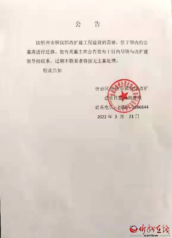 因忻州市殯儀館改擴建工程建設(shè)的需要,位于館內(nèi)的公墓需進行遷移(不涉及骨灰寄存)。望有關(guān)墓主在公告發(fā)布十日內(nèi)盡快與改擴建領(lǐng)導組聯(lián)系。過期不聯(lián)系者將按無主墓處理。