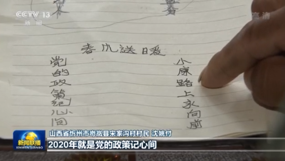 山西省忻州市岢嵐縣宋家溝村村民沈姚付:2019年我寫脫貧不忘共產(chǎn)黨,感恩四方,就是四面八方的游客來吃我的涼粉,也是幫助我脫貧。2020年就是黨的政策記心間,小康路上要永遠向前,春風送暖。