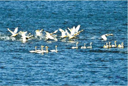 春日里的暖陽將河水消融,雙乳湖上的白天鵝美得讓人沉醉。它們是大自然的精靈,用頎長(zhǎng)的脖頸搖撼著冬日的死寂,用輕盈的羽扇靈動(dòng)了粼粼蕩漾的河面,用點(diǎn)點(diǎn)乳白畫出了繁花似錦的春天。