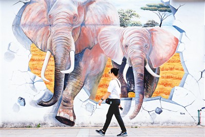游客行走在安徽省合肥市廬江縣湯池鎮(zhèn)果樹村文化廣場藝術(shù)畫前。王閩 攝(人民圖片)