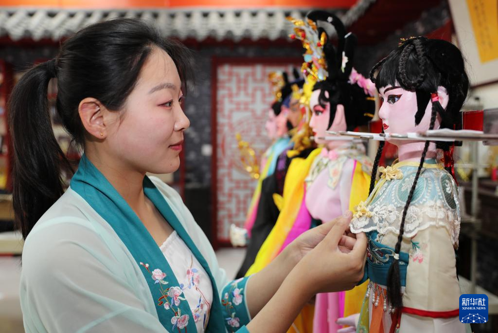 5月21日,在山東青島,萊西木偶藝術(shù)團(tuán)的演員在整理木偶裝扮。
