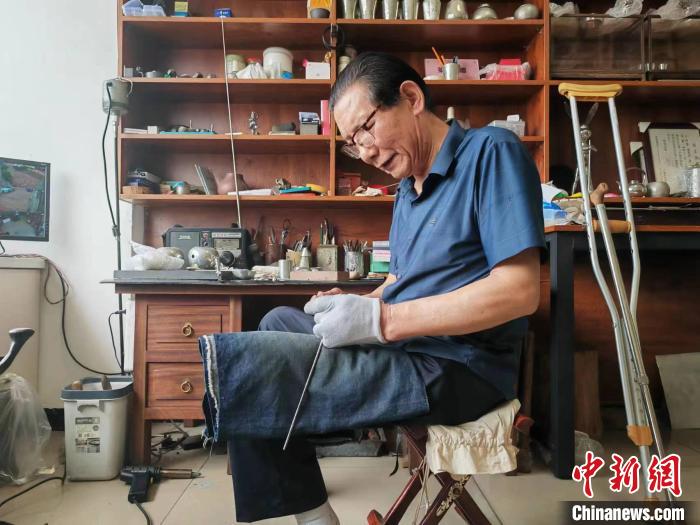 王圣良告訴記者,小時候他因為生病,腿腳落下了殘疾,別的兄弟姐妹出去玩,他就跟著爺爺學習錫雕?!白鲥a雕需要心靜、身靜,因為行走不方便,我比其他人更坐得住,在學習錫雕上更有‘優(yōu)勢’”。