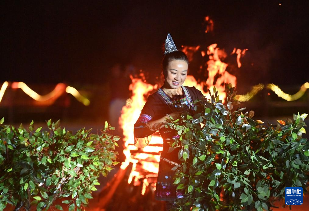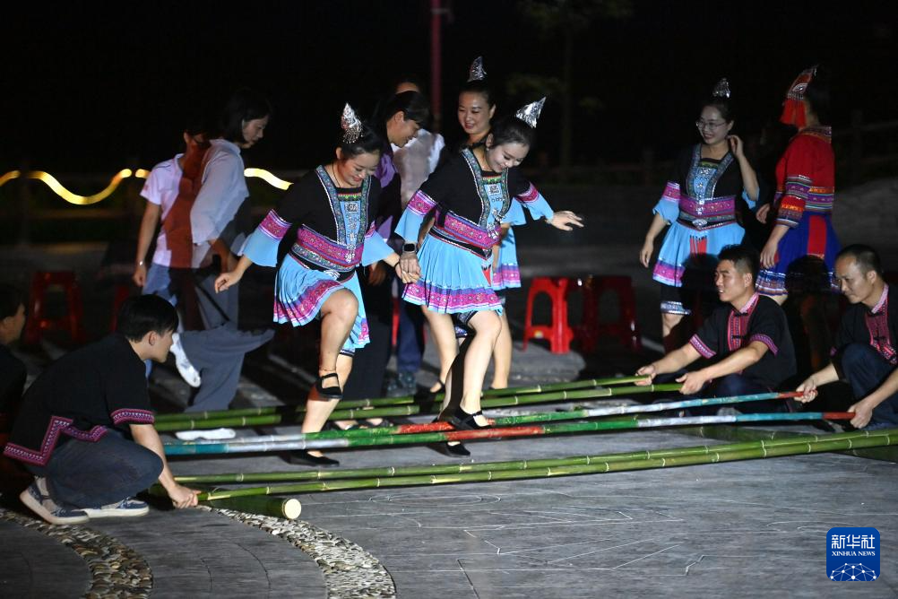 9月5日,在梧州市蒼梧縣六堡鎮(zhèn)山坪村同心廣場,各族干部群眾在篝火晚會上跳竹竿舞。