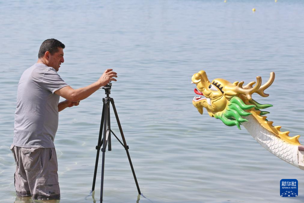 9月8日,一名攝影師在以色列阿卡給龍舟拍照。新華社記者 王卓倫 攝??