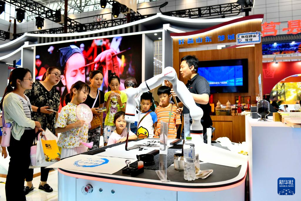 9月16日,在山東國(guó)際會(huì)展中心,來(lái)自濟(jì)寧市的參會(huì)人員在展示機(jī)器人書寫漢字。