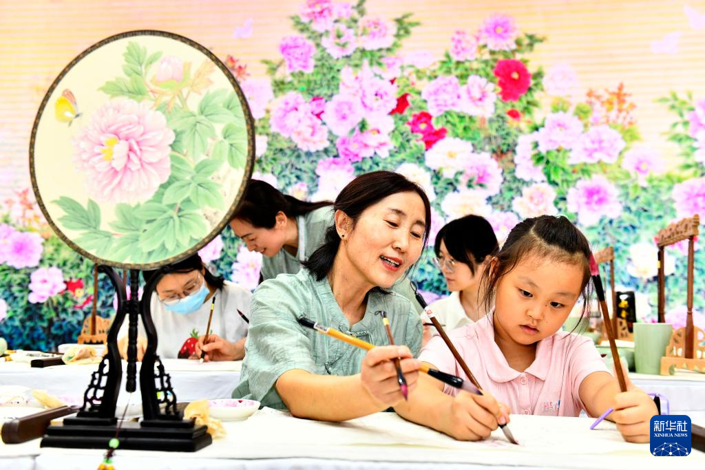 9月16日,在山東國(guó)際會(huì)展中心,來(lái)自巨野書畫院的藝術(shù)工作者姚愛(ài)紅教孩子給工筆牡丹畫上色。