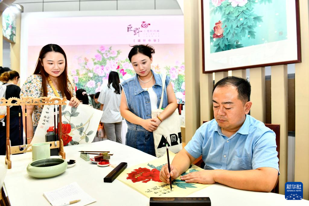 9月16日,在山東國(guó)際會(huì)展中心,來(lái)自巨野書畫院的藝術(shù)工作者侯福常(右一)在展示工筆牡丹畫技藝。
