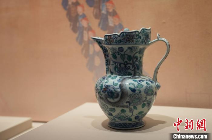 2月27日,正在“御瓷歸來”展覽上展出的“清乾隆時(shí)期斗彩螭龍穿花紋僧帽壺”。 劉思偉 攝
