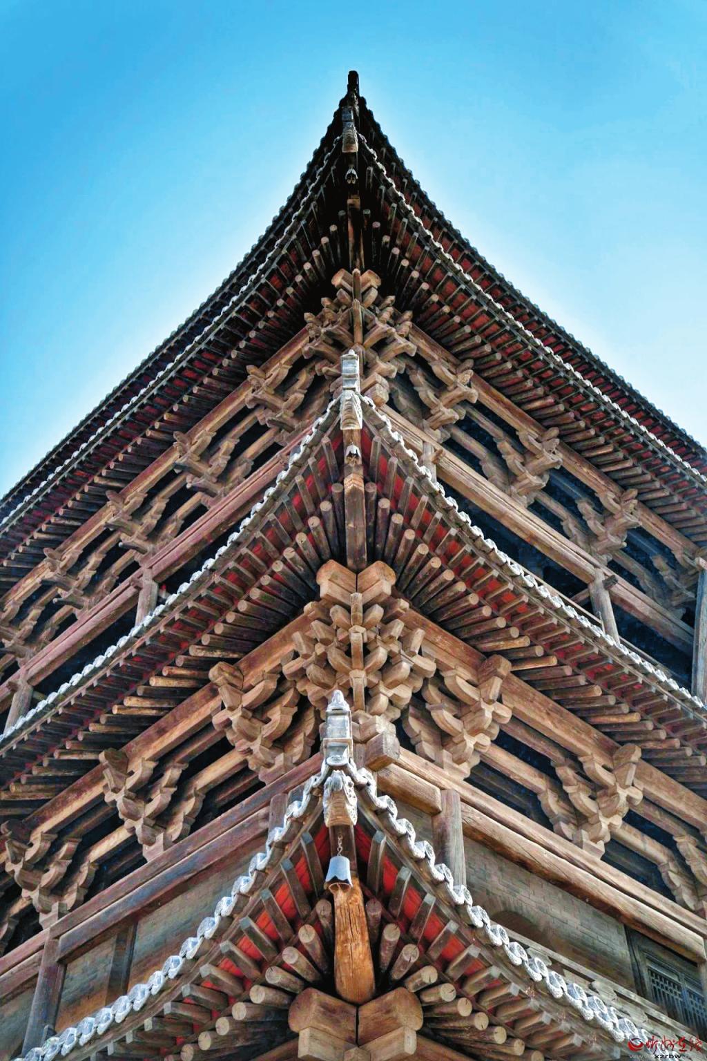 斗拱的分布,除柱頭科和角科外,前后檐明間平身科兩攢,次、梢間和兩山各間皆一攢。二層檐下施五踩雙翹頭,角科加施斜翹頭一縫。三層平座五踩雙翹頭,三層廊下施五踩重昂,三層上檐五踩雙下昂,角科加施角昂和由昂。角科正側(cè)兩面于當(dāng)心翹頭外向增翹頭一列。斗拱制作規(guī)整,結(jié)構(gòu)精巧,構(gòu)造嚴密適度。