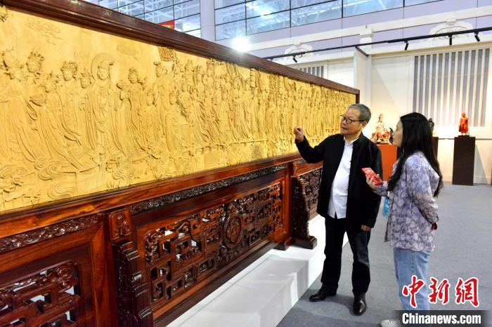 5月9日,第四屆中國工藝美術博覽會在福建福州啟幕,圖為雕漆作品《凈土文化對瓶》吸引觀展者目光。 中新網記者 呂明 攝