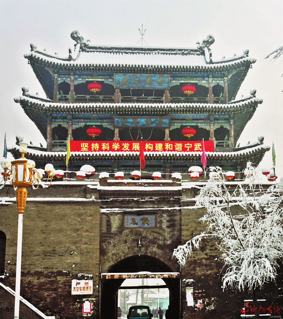 寧武關(guān)城,古稱鳳凰城,因為城南面對的是鳳凰山,又因城池布局酷似展翅欲飛的鳳凰而得名。順華蓋山南麓因勢而筑的城池猶如鳳身,華蓋山頂?shù)淖o城墩為鳳首,向東西兩側(cè)延伸的大河堡、寧文堡猶如鳳凰展開的雙翅,高高聳立于南城墻的迎薰門是鳳尾,城內(nèi)中心的鼓樓是心臟。站在城南的鳳凰山瞭望這座城池,日間城垛高壘,夜間萬家燈火,由低而高,一只栩栩如生的鳳凰便展現(xiàn)在眼前。
