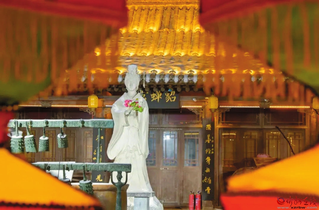 現(xiàn)在的貂蟬陵園是在墓地原址重新筑砌的,坐北朝南,門檐上懸“貂蟬陵園”橫匾,兩側(cè)有“閉月羞花堪為中國驕傲,忍辱步險(xiǎn)實(shí)令須眉仰止”的金文楹聯(lián)。園內(nèi)用花墻分隔成南、北兩部分,北為陵區(qū),南為展區(qū)。南院建貂蟬彩塑館,再現(xiàn)“貂蟬迎賓”“羞花問世”“祭山驚艷”“落難認(rèn)父”“拜月銘志”“憂國請(qǐng)纓”“施計(jì)除奸”“繡袍寄情”等場(chǎng)面,反映了貂蟬“不惜萬金軀,何懼險(xiǎn)象生”的一生。