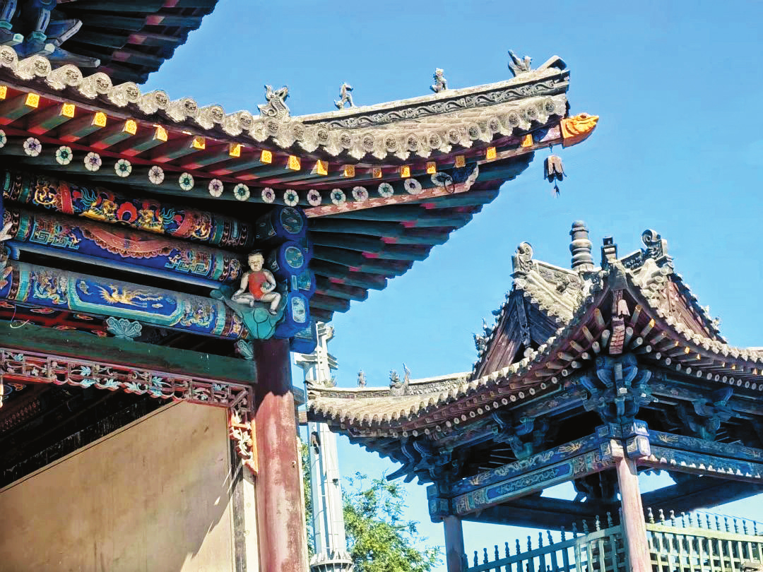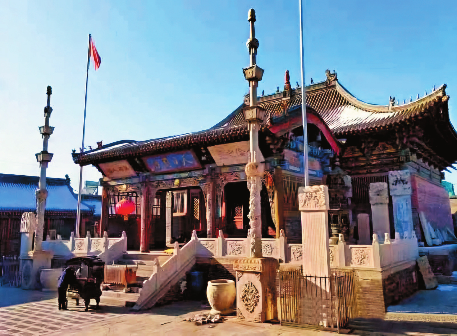 武廟內(nèi)的主要建筑是按照帝王殿宇的規(guī)制和風(fēng)格建造,以關(guān)帝殿為例,屋頂采用的是單檐廡殿頂,構(gòu)架為七檁前后廊式,前后檐柱頭科為五踩單翹單昂,前檐明次間施四扇六抹格扇門。廟內(nèi)楹聯(lián)所題文字均鑲銅材,各殿塑像也多為銅制,這與代縣歷史上盛產(chǎn)銅且擅長制作銅器有很大關(guān)系。