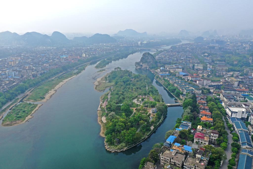 生態(tài)修復(fù)改造后的漓江伏龍洲景色(無人機(jī)照片)。新華社記者 周華 攝