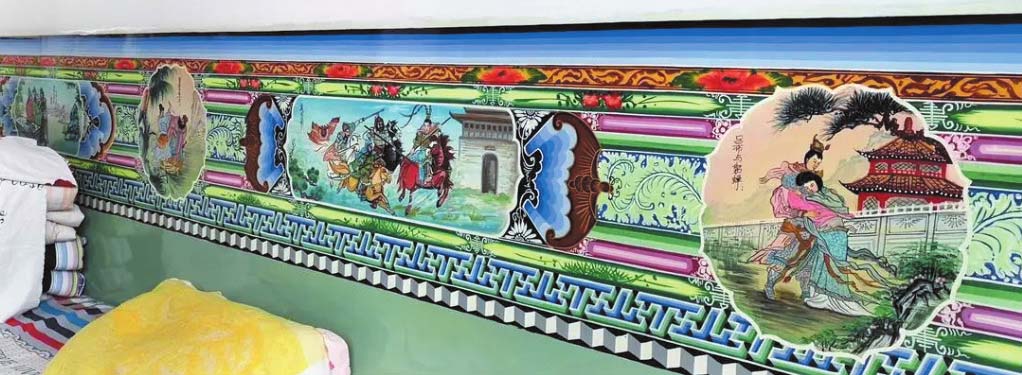 炕圍畫(huà)也叫墻圍畫(huà),距今已有1200多年歷史,是原平人特有的“根脈性”藝術(shù)。手工藝人以墻為紙,將民族文化與當(dāng)?shù)厣睢⒕袂擅钊诤?,造型藝術(shù)集壁畫(huà)、年畫(huà)和建筑彩繪于一體,定格于墻壁之上,代代相傳。“17歲起,我就跟隨父親學(xué)習(xí)炕圍畫(huà)技藝,如今有60多年了?!惫M(jìn)壽感慨道,“以前家家戶戶都會(huì)在炕邊畫(huà)炕圍畫(huà)。隨著時(shí)代變遷,人們住進(jìn)了樓房,我們就把炕圍畫(huà)畫(huà)在紙上?!?/p>