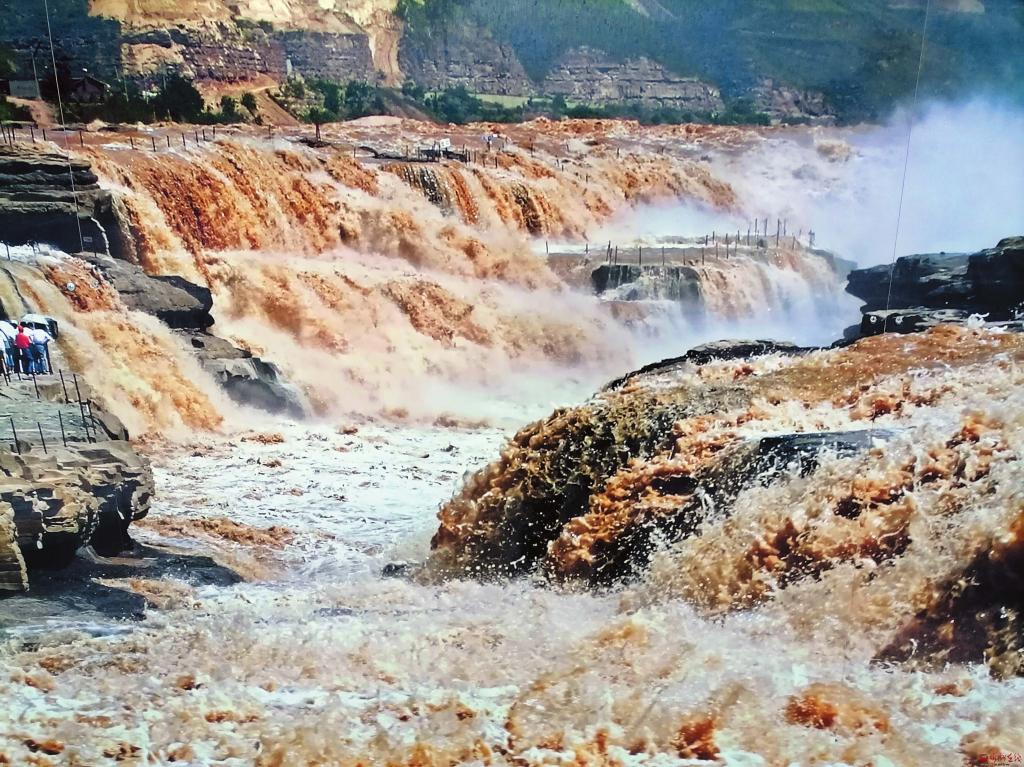 次日一大早,我獨(dú)自沿著黃河岸邊山西吉縣段向北行走,邊鍛煉身體邊觀瀑。黃河奔流至此,石壁峭立,河口收縮如壺口,故名。河面壓縮到二三十米,每秒一千立方米的河水,從二十多米高的陡崖上傾注而瀉,形成“千里黃河一壺收”的壯美景象。壺口瀑布是國家5A級風(fēng)景名勝區(qū),東瀕山西省吉縣壺口鎮(zhèn),西臨陜西省宜川縣壺口鎮(zhèn),為兩省共有的旅游景區(qū)。一瀑布連二省,同名同鎮(zhèn),秦晉之好,傳為佳話。