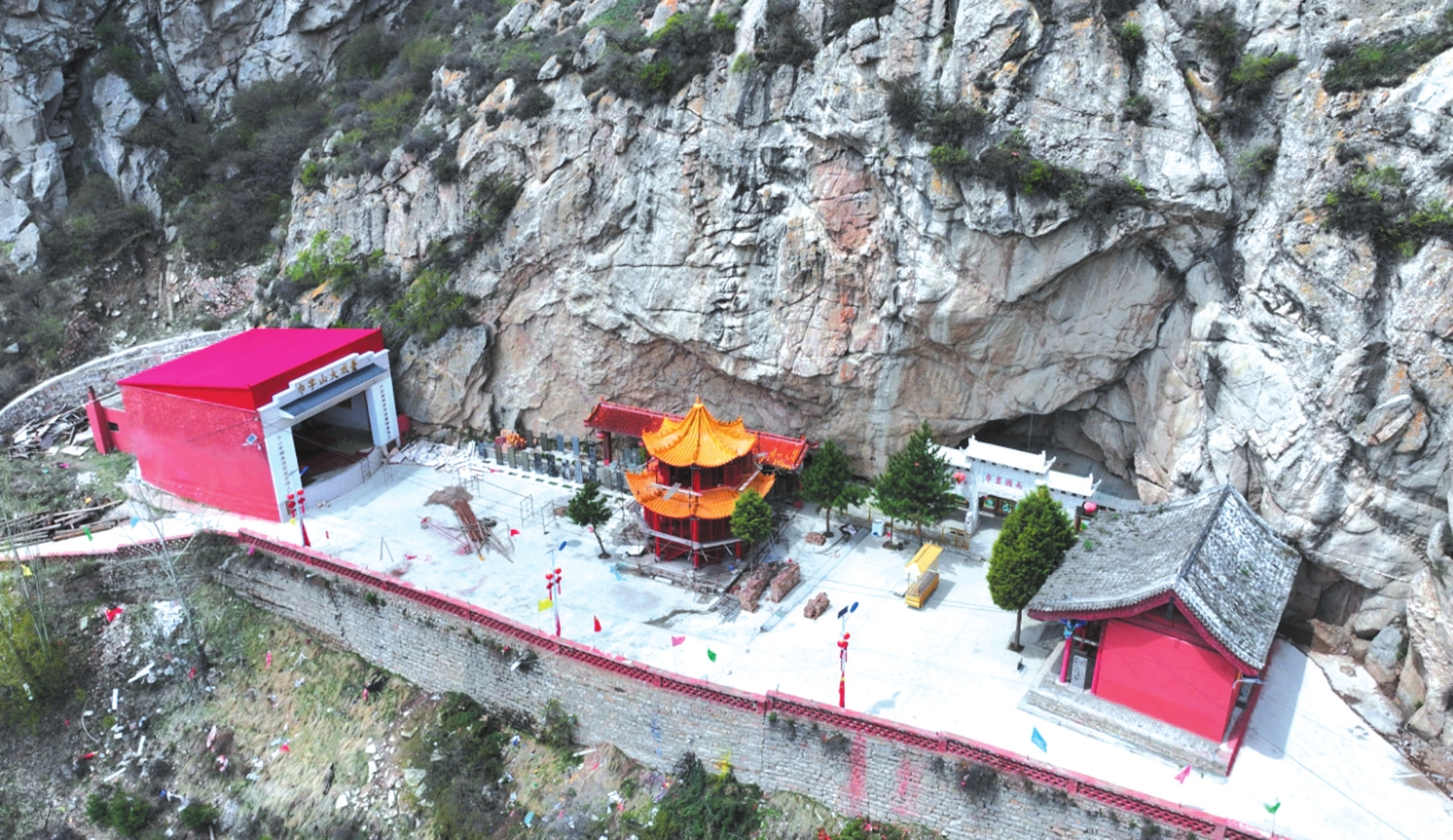春日里,山桃花與山杏花沿坡綻放,粉白相間的花海從山腳漫至山腰,與翠綠的松柏相映成趣。此時若恰逢細雨,云霧在花間游走,“巾巖瀨雨”的奇景尤為靈動,水滴擊石的清音與花開的簌簌聲交織,仿佛天地間的私語。盛夏時節(jié),山中松濤陣陣,涼意襲人。雙巾峰下的“沁心泉”水量充沛,泉水清冽甘醇,飲之可去暑熱。沿山路行至“回音壁”,一聲呼喊能引來七聲回應(yīng),故又稱“七響巖”。傍晚時分,夕陽為石灰?guī)r峰巒鍍上金邊,池面波光粼粼,形成“巾峰夕照”的景致,與“瀨雨”并稱山中雙絕。秋日登高,則見株株松樹挺拔直立,廟宇與油松交相輝映,層林盡染。此時“瀨雨”之景尤為別致,洞內(nèi)泉水如鐘表滴答,當?shù)厝朔Q為“秋漏”。有現(xiàn)代詩人描繪此景:“巾巖雄峙,霧繞云纏多靈氣;瀨雨淋漓,珠垂墜玉一奇觀?!毙蜗蟮匕炎匀恢襞c時間之感巧妙融合。冬雪初霽時,巾字山銀裝素裹,雙巾峰如白玉雕琢的冠冕,“瀨雨”洞洞外凝結(jié)的冰棱如水晶簾幕,陽光折射下七彩斑斕,構(gòu)成冬日里的清麗樂章。