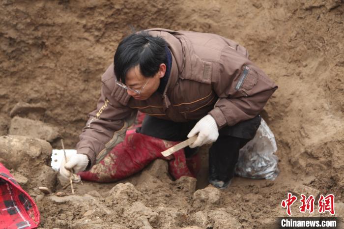 2012年1月16日,何利群在鄴城遺址東郭區(qū)佛教造像埋藏坑遺跡進行現(xiàn)場發(fā)掘。 (鄴城考古隊供圖)