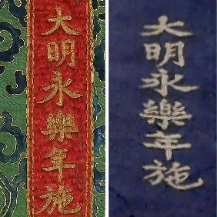 ▲明永樂(lè)織錦勝樂(lè)金剛唐卡右上角六字金色漢文楷書(shū)“大明永樂(lè)年施”題款。 在這幅織錦唐卡中,勝樂(lè)金剛的眉毛變成了裝飾性的一波三折形狀,眼睛狹長(zhǎng)而微曲,眼外角細(xì)長(zhǎng),眉目含笑,如同明代工筆畫(huà)中的人物眼神;眉頭皺起和鼻頭聳起的紋路均大量減少,更似靜善相神靈面相,符合內(nèi)地審美習(xí)慣。在構(gòu)圖上,主尊均占據(jù)了絕大部分畫(huà)面,顯得主體突出,氣勢(shì)恢宏。在美學(xué)傳統(tǒng)上,永樂(lè)年款唐卡呈現(xiàn)出漢藏融合的風(fēng)格特征,尤其是巨幅的形制、主尊突出的構(gòu)圖被藝術(shù)史學(xué)者們認(rèn)為是融入了明成祖朱棣的審美喜好。 永樂(lè)為中國(guó)明朝第三位皇帝明成祖朱棣的年號(hào)。永樂(lè)年間是明朝全面治理西藏的關(guān)鍵時(shí)期。明成祖一方面繼承太祖對(duì)西藏的治理政策,進(jìn)一步拓展?jié)h藏交通,加強(qiáng)并深化內(nèi)地與西藏的聯(lián)系;另一方面明成祖派遣劉昭、何銘等人入藏冊(cè)封僧俗首領(lǐng),強(qiáng)化了對(duì)西藏地方的行政管理。 為保證明朝使臣可以順利入藏,明朝動(dòng)用洮州、河州、西寧三衛(wèi)及道路沿途各處的物力人力,對(duì)經(jīng)過(guò)甘青地區(qū)、朵甘地區(qū)的青藏道進(jìn)行維護(hù),并派遣川藏各族軍民對(duì)道路進(jìn)行修復(fù)。設(shè)立驛站,整修道路,這是明朝仿效元朝對(duì)西藏地方加強(qiáng)管理的開(kāi)始。 永樂(lè)皇帝根據(jù)西藏地方僧俗共治的政治生態(tài),在政治、經(jīng)濟(jì)方面加強(qiáng)漢藏聯(lián)系的基礎(chǔ)上,更為注重文化、宗教的紐帶作用,這些舉措深刻影響西藏地方的政治、經(jīng)濟(jì)、文化各個(gè)方面。 在禮儀治邊疆的“大一統(tǒng)”格局之中,宮廷御制織繡唐卡成為朝廷回賜給西藏地方僧俗首領(lǐng)的禮物,于明代永樂(lè)宣德時(shí)期發(fā)展到高峰,并延續(xù)至清代宮廷。 織繡唐卡作為藏傳佛教圖像與中原織繡工藝相結(jié)合的獨(dú)特品類(lèi),是漢藏民族在禮儀制度、佛學(xué)思想、藝術(shù)美學(xué)等方面交往、交流與交融的歷史見(jiàn)證。 02 “大明永樂(lè)年施”與三大法王 由于勝樂(lè)金剛唐卡上的“大明永樂(lè)年施”題款只標(biāo)識(shí)著賞賜者永樂(lè)皇帝的信息,受賜者并不明確,故成為學(xué)者們考證的熱點(diǎn)和難點(diǎn)。又因?yàn)樘瓶ㄖ猩戏缴蠋熜∠癫⑽达@示出明確的教派傾向,故只能說(shuō)明此類(lèi)唐卡與三大法王有關(guān)。 通過(guò)對(duì)已公布的“大明永樂(lè)年施”題款織繡唐卡進(jìn)行圖像與文字描述的核對(duì),筆者共統(tǒng)計(jì)到6幅同款唐卡,其中包括曾拍出天價(jià)的永樂(lè)御制紅閻摩敵刺繡唐卡。